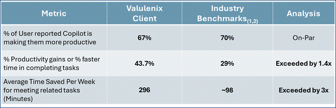 POC participants saw a 43% average productivity increase, with 67% noting positive effects on workflow efficiency. Each saved about 50 minutes weekly, suggesting strong company-wide financial benefits at scale. Also, the POC outperformed some industry benchmarks noted in the table below. With these results, Valulenix helped the client validate the business impact and justify the investment of upskilling staff with GenAI tools.